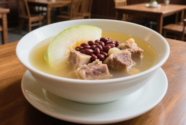 材料:带皮冬瓜 500 克、红小豆 50 克、排骨 250 克、姜片 3 片。