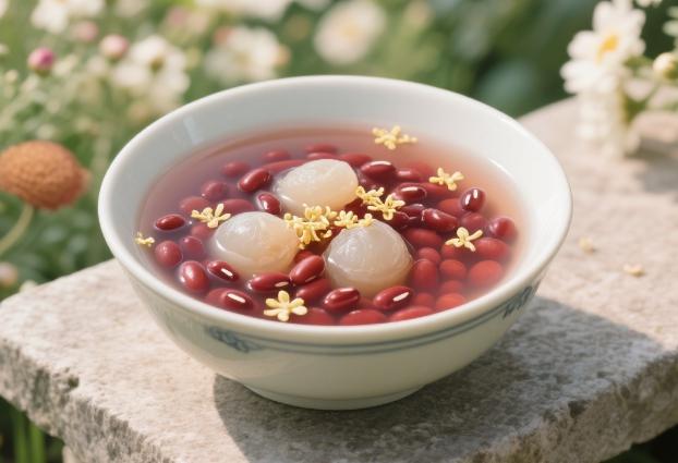 材料:红豆 50 克、桂圆肉 20 适当的克、桂花、红糖。