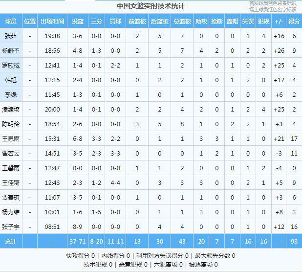 王思雨 8 中 6 拿到 17 分 3 助攻 3 断球,翟若云 11 分,杨舒予 9 分 7 板 4 助 2 断,王佳琦 9 分 3 板 3 助,张茹 6 分 7 板,贾赛琪 6 分,陈明伶 4 分,罗欣棫 4 分,韩旭 4 分,杨力维 3 分 3 助,李缘 2 分,潘臻琦 2 分,王馨雨 0 分。