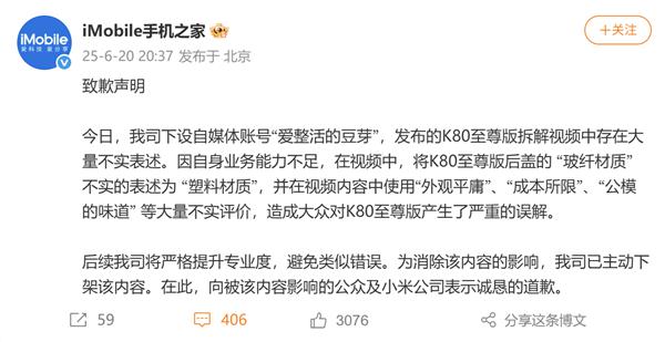 快科技 6 月 21 日前消息,日前,iMobile 移动电话之家官微发表了道歉声明。