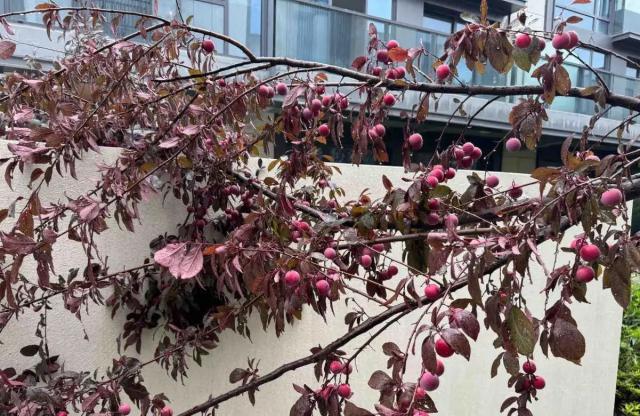 在长三角地区,紫叶李是一种常见的景观树木,最近许多杭州市民也“念念不忘”地走上了街头,紫叶李硕果累累。