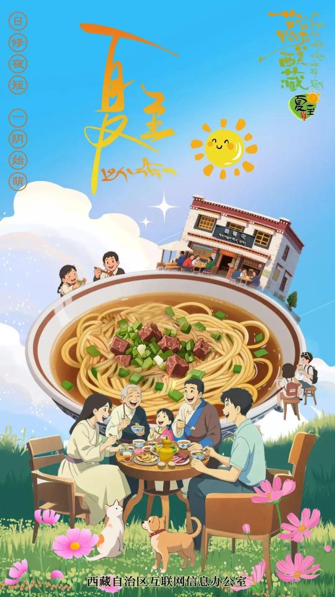 从那以后,白昼已经到了云极,宵夜已经过去了。夏至是一年中白天最长,晚上最短的一天。夏至过后,白天开始慢慢变短,就像民间说的“夏至吃面,一天短一线”。吃面条是夏至的常见习俗。人们通过吃面条来庆祝夏至的到来,并期待健康、长寿和更好的生活。在西藏,去甜茶馆吃一碗美味的牦牛骨汤面,正好符合这个古老的传统。