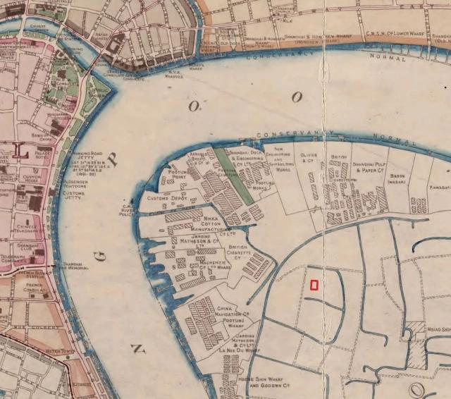 陈桂春房屋的大致位置(图中红框),当时陆家嘴临江已遍布码头和仓库,陈宅所在的腹地,也是江南水乡的一个城镇。