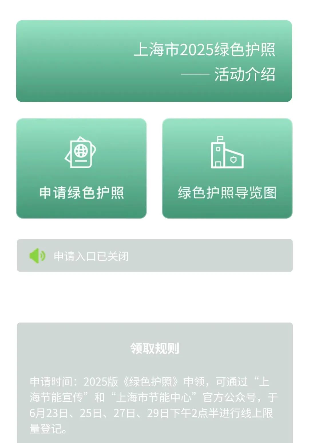 申请成功的市民朋友可以在2025年6月23日至7月31日期间每周六10日进行。:00—12:30、13:30—16:00,凭信息和身份证到上海科学节能展览馆(花园路171号A1一楼)领取绿色护照。如有疑问,请致电36363555。