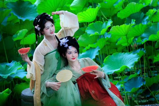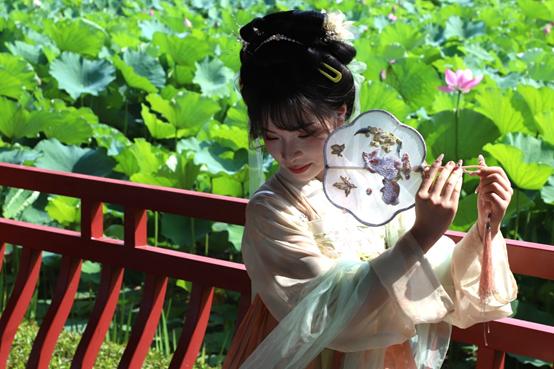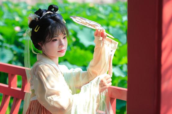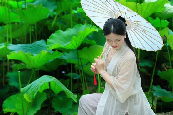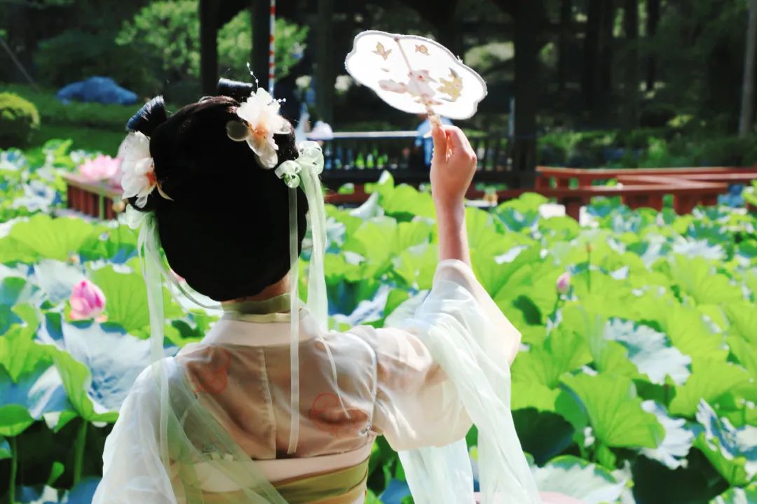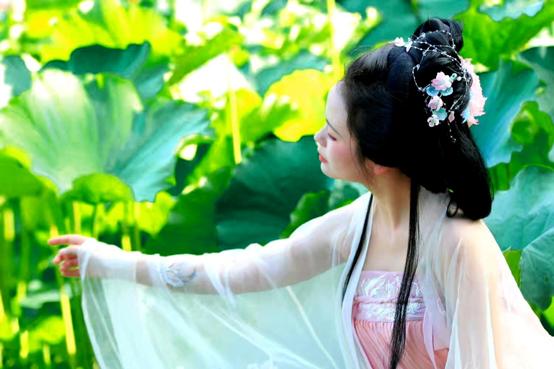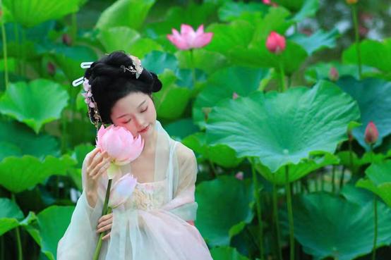 汉服:淡雅的浅色汉服,与荷花的清新气质相辅相成,随风飘动的衣服,可以为照片增添灵动之美。