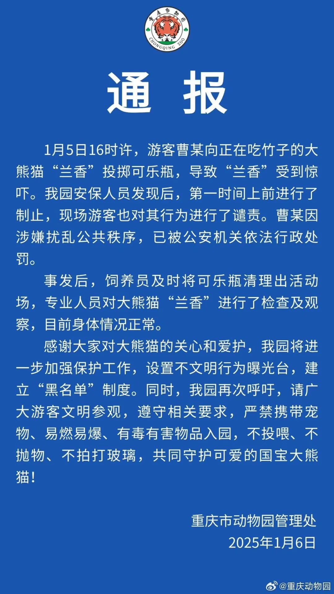 今年1月6日,重庆动物园通报了一起不文明的现象。游客曹某把可乐瓶扔给正在吃竹子的大熊猫“兰香”,这让他很害怕。通知中还提到,重庆动物园将设立不文明曝光平台,建立“黑名单”制度。