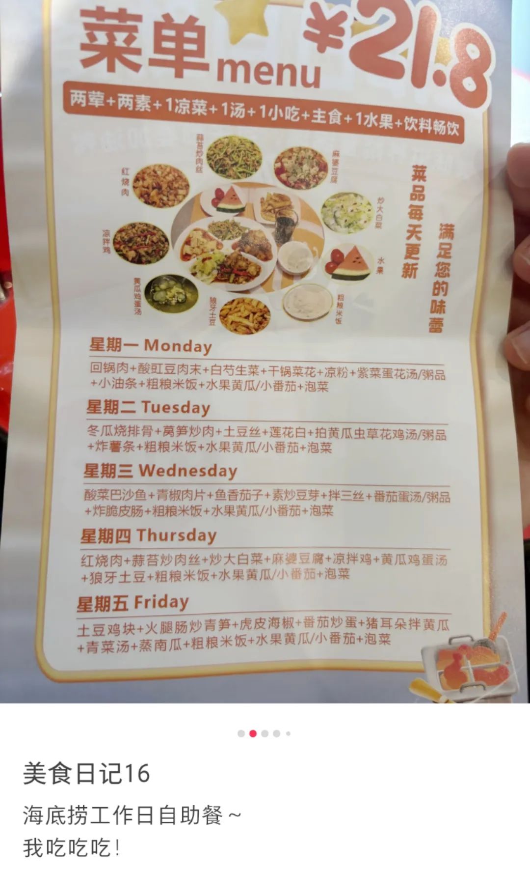 海底捞自助午餐,包括不同的肉类和蔬菜,很快被组合成体面卫生的农民工减脂餐。“我们公司没有食堂,外卖很油。海底捞的午餐干净安全,可以根据自己想要的热量摄入来搭配。”上海的小伊分享道。