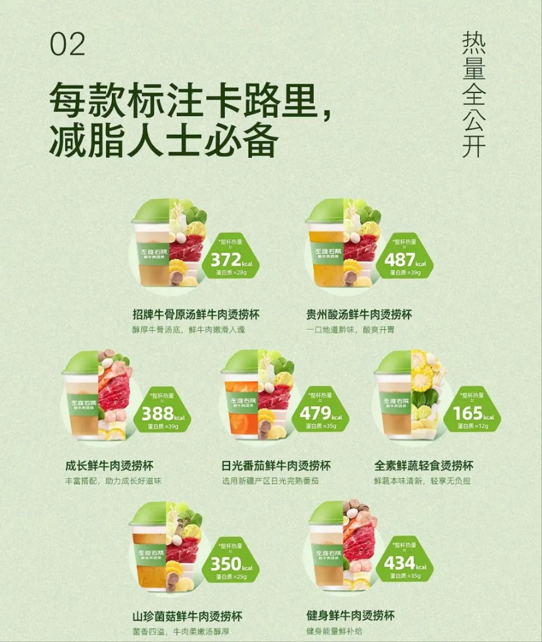 以左庭右院为例。作为潮汕牛肉火锅的代表品牌,其推出的“鲜牛肉热捞杯”采用牛骨清汤,主要推广“高蛋白、低热量”等时令新鲜蔬菜。单杯含200g鲜牛肉,热量标注400卡路里,满足健身人士和白领的健康需求。