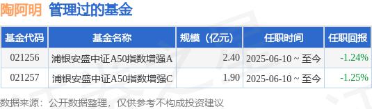 陶阿明先生:中国国藉,复旦大学金融工程管理硕士学位。2014 年 6 月至 2015 年 3 每月在银联商务有限公司工作,担任业务管理部门的数据分析师。2015 年 3 月至 2021 年 7 每月在国投瑞银基金管理有限公司工作,担任量化投资部研究员。2021 年 7 月加盟浦银安盛基金管理有限公司,曾担任指数、量化投资部金融分析师、研究员、基金经理助理等职务,现任指数和量化投资部基金经理。2025 年 6 月 10 日任浦银安盛中证 A50 指数强化型证券基金经理。