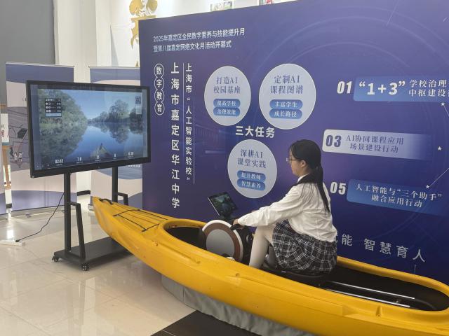 另一方面,华江中学七年级(5)班的学生朱昱诺刚刚进行了室内皮划艇训练。与室外相比,室内皮划艇减少了天气和落水的影响。在屏幕的加持下,前方可以看到风景,沉浸感一点也不少。“这艘皮划艇需要我的手脚协调。划起来有点累,但也很酷!”朱昱诺说。