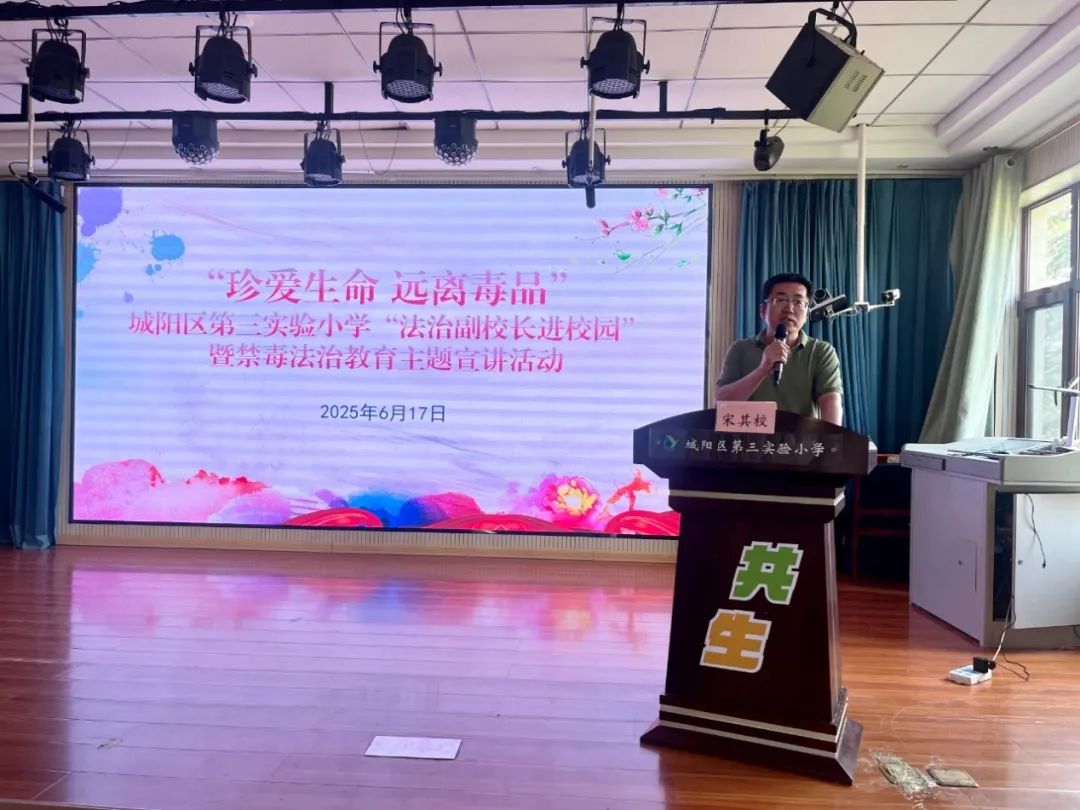 城阳区第三实验小学开展了“法治副校长校园禁毒法治教育”主题宣传活动。