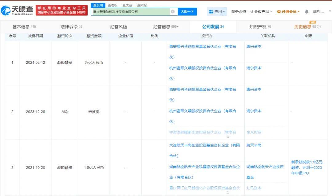 天空调查显示,新承航锐已经完成了海尔资本、湖南航空航天产业投资基金、云晖资本等三轮融资。