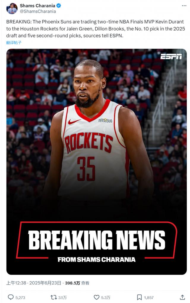 北京时间 6 月 23 日凌晨,NBA 名记 Shams 报告说,火箭和太阳完成了交易:火箭把杰伦送出去 - 格林、狄龙 - 布鲁克斯、2025 年首轮 10 号签,以及 5 个次轮签,8 换 1 获得凯文的交易 - 杜兰特!千算万算,没想到杜兰特交易总决赛 G7 是同一天!
