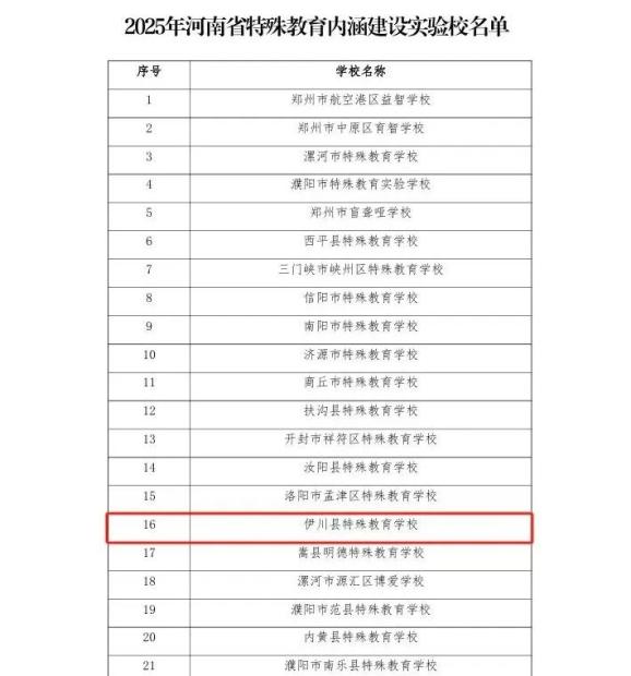 日前,河南省教育厅公布了2025年特殊教育向高中延伸实验学校和内涵建设实验学校的评选结果。伊川特殊教育学校成功入选“河南特殊教育内涵建设实验学校”!