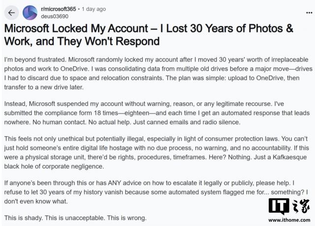 IT 世家 6 月 22 日消息,Reddit 客户 @deus03690 帖子说它很无聊,它很无聊, 30 多年来积累的无数“珍贵照片和工作资料” OneDrive 由于微软没有警告,没有理由冻结账户,根本无法打开。