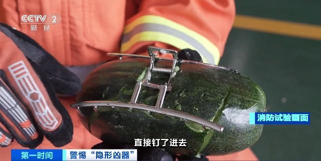 江苏省连云港的消防队员使用了1.65米高的60KG娃娃进行模拟试验。在实验中,消防队员将冬瓜固定在娃娃的后脑勺,直接推翻娃娃,冬瓜几乎没有受到伤害。然后,消防队员将金属“鲨鱼夹”夹在冬瓜上,固定在娃娃的头上,然后以同样的方式推翻娃娃。金属“鲨鱼夹”的锯齿穿透了冬瓜的皮肤,直接“钉”了进去。