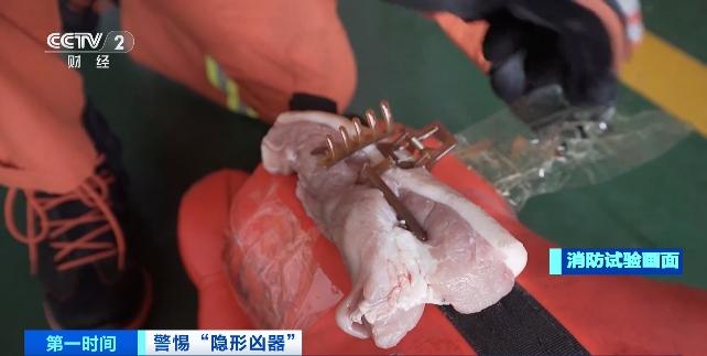 换成塑料发夹会怎么样?在对比试验中,消防队员将鲜肉绑在娃娃的后脑勺上,模拟头部皮肤,并夹上塑料发夹。可以看到,娃娃倒在地上的那一刻,塑料发夹的梳齿被打碎,形成了能划伤皮肤的锐利棱角。