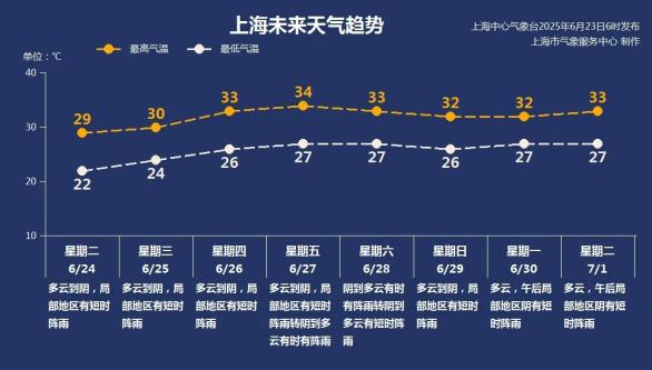 六月二十四日(星期二):多云到阴,局部短时阵雨,22~29℃
