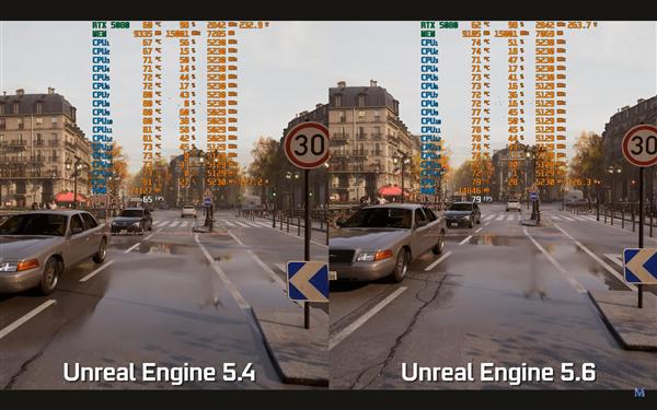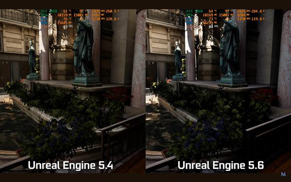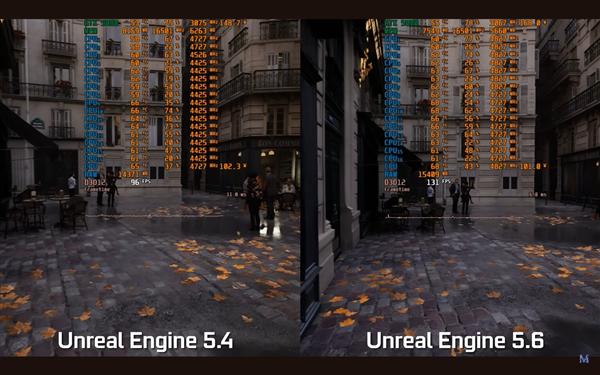油管博主 MxBenchmarkPC 对虚幻发动机进行对比测试 5.6、5.4 版本,跑了 Paris Tech DEMO,显卡是 RTX 5080,结果发现性能发生了可喜的变化。