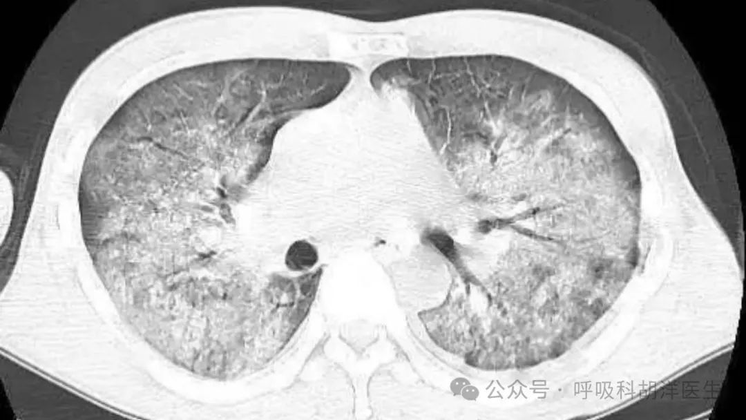 当时用的烤油膏应该是三无产品。烤油的时候头皮疼。烤油后,当时没有反应。回家后第三天,我开始肩膀和背部出现大块皮疹。我去当地医院打了一针。皮疹退去后不久,就出现了咳嗽症状。干咳是主要症状,逐渐加重,出现哮喘。白肺表现已经出现在当地的CT检查中。虽然用了很多好药,但是病情还是逐渐加重。虽然来找我的时候看上去病情比较轻微,但实际上是因为她身体很好,还能坚持走路,住下后很快就会呼吸衰竭。