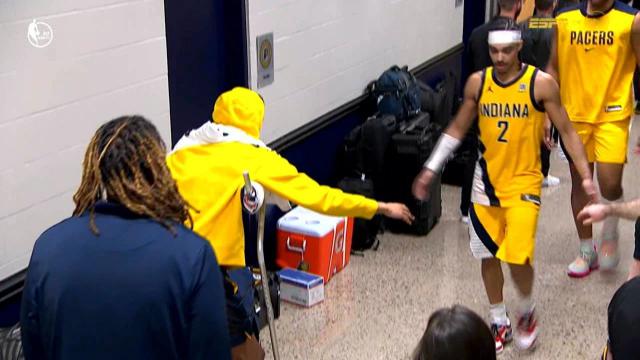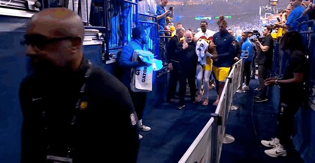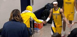 比赛结束后,哈利伯顿拄着拐杖,在球员通道等待队友回来,这一幕的确令人感动。