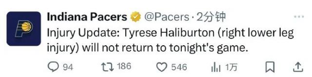 据记者报道,担架被运送到步行者的更衣室。随后,步行者正式发表声明:“哈利伯顿右小腿受伤,退出比赛。”