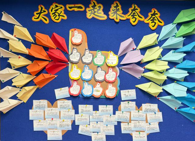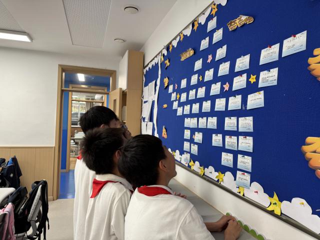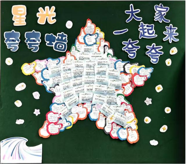 伴随着卡片的不断收集,学生们的创造力得到了充分的激发,打造出各具特色的班级“星光夸夸墙”。预初 2 班级把导师卡拼成“爱”,学生用便利贴写下对老师的赞美,完成了师生之间温暖的双向前进;一年级(11)班级用导师卡拼出“拇指”的形状,搭配翅膀,意味着老师的鼓励帮助学生追求梦想;二年级(3)班级将个人夸夸卡拼成灿烂的“太阳”,意思是“赞美是心中不朽的光”;二年级(2)班以导师卡为星轨,围绕着同学卡拼出的星星,诠释“在肯定中闪耀自我”的深刻含义。