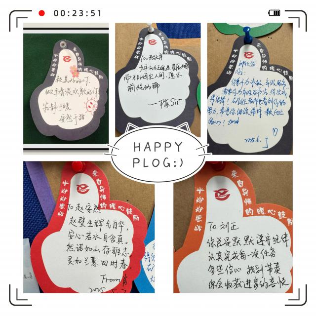 各班根据自身特点,在收集“夸夸卡”的过程中,开展了各种活动形式。或者学生化身为“赞美收藏家”,仔细捕捉生活中温暖的话语,主动邀请学生在卡片上留言;或者组织“夸夸交换会”,让每一个学生都给身边的伙伴送上真诚的赞美和交换卡片。同时,导师们也全身心地投入到“导师夸夸卡”上,认真地写出充满深情和期待的话语,送给学生。这些卡片承载着老师的认可和鼓励,然后巧妙地融入到每个班级的教室布局中,使这种感觉不再转瞬即逝,而是成为班级文化的一部分,不断为学生注入信心和力量。