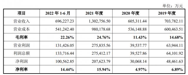 业绩方面,2019 年到 2021 年及 2022 今年上半年,公司的营业收入分别为 70.38 亿元、60.53 亿元、130.28 亿元和 69.62 一亿元,毛利率分别为 14.68%、11.43%、24.76% 和 22.26%,净利润分别为 4.85 亿元、3.01 亿元、20.76 亿元和 10.06 亿元。