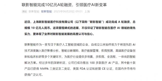 联影智能获得10亿元A轮融资,红杉高管入驻董事会。