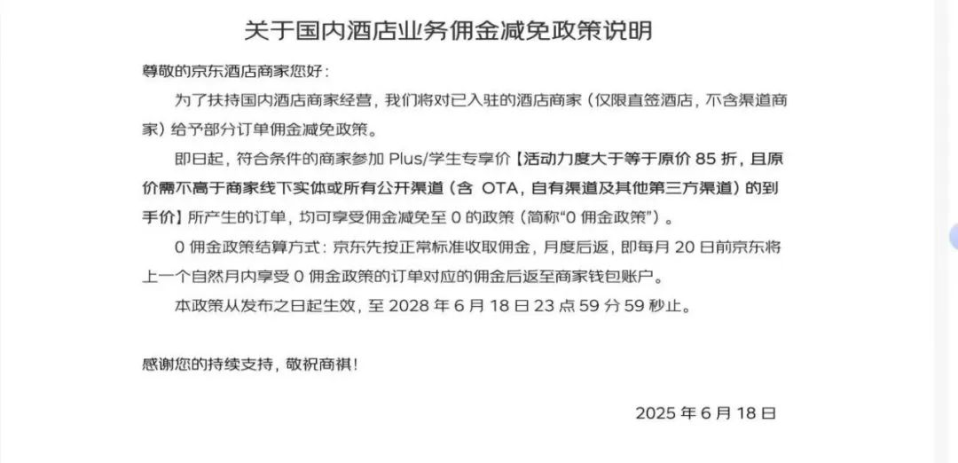和新闻标题不同,商家拿到的京东官方《国内酒店业务佣金减免政策说明》中写得很清楚: