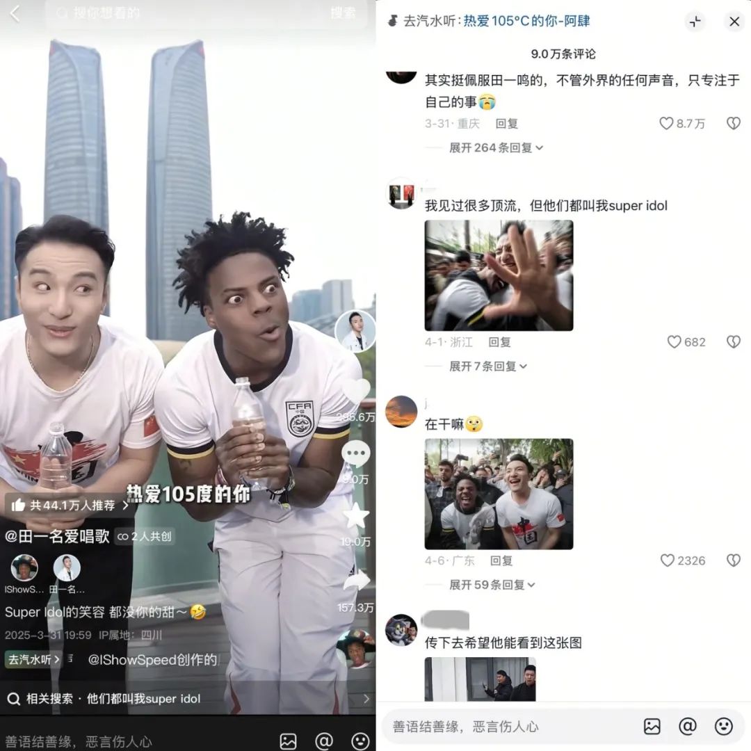这个看似偶然的内容同创联动,文化符号的本质碰撞。田一以“高品质男人”的形象爆红,甲亢哥则以抽象癫狂风格风靡欧美,两者的对比感自然具有传播张力。