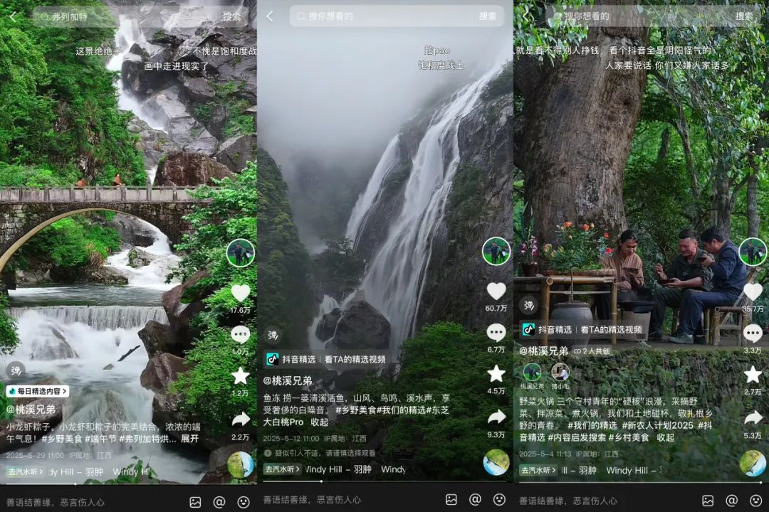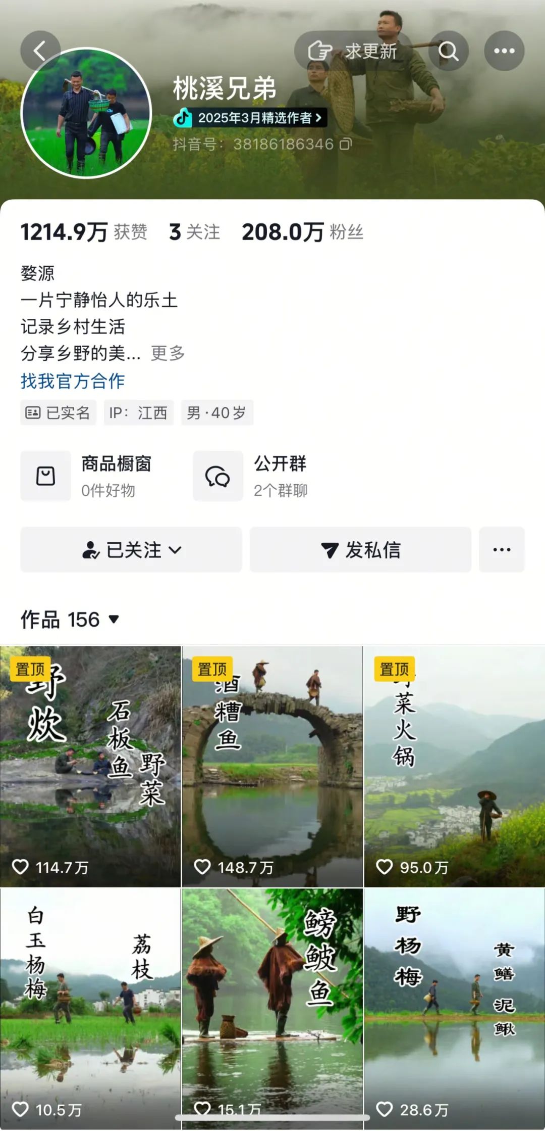 @桃溪兄弟的内容正好符合这个导向。婺源景色频繁出现在视频中,可能会通过场景展示和口碑传播间接促进当地农产品和旅游业的发展。