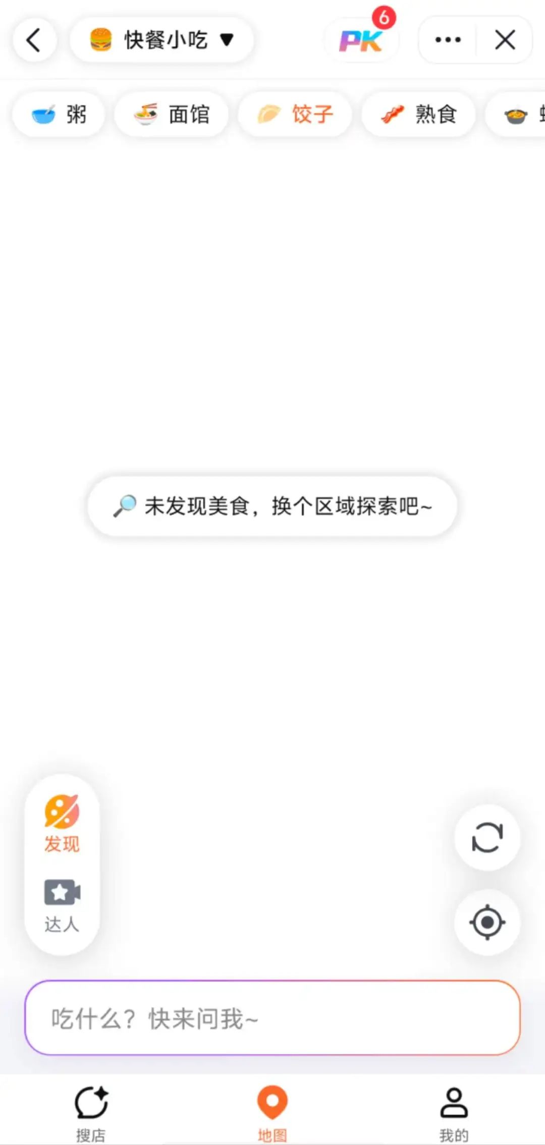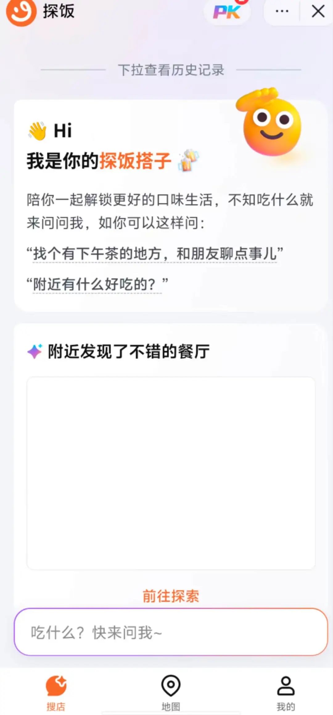 探饭还支持地图找店,可以在地图上找到美食店(注:作者周围暂时没有看到美食店),确定商店后可进行导航,导航需要跳转到高德地图。