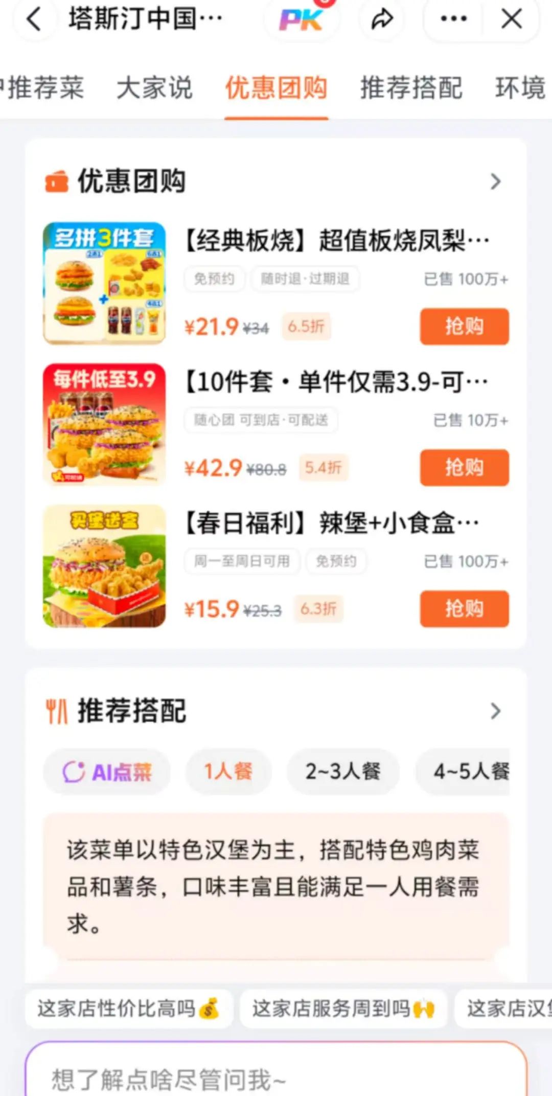 探饭还具有AI点餐功能,选择好的人数、口味偏好或忌嘴,AI便会推荐合适的团购菜单供用户参考。
