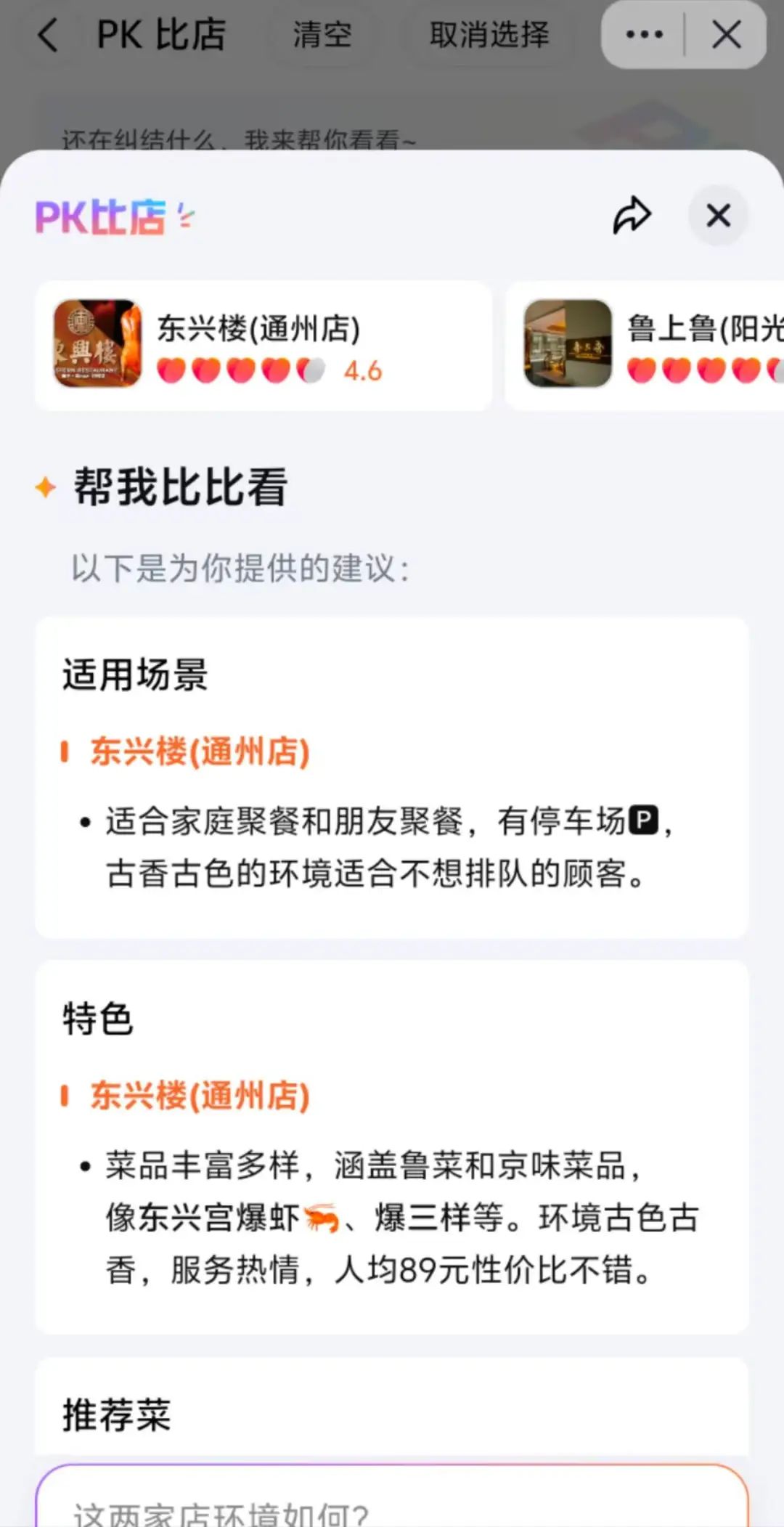 如果用户还是很难对列出的美食店做出决定,也可以通过PK比较店铺功能,进一步选择合适的美食店。探索餐会从适用场景、特点、推荐菜品、优缺点等维度进行竞争,并进行总结,让用户做出判断。