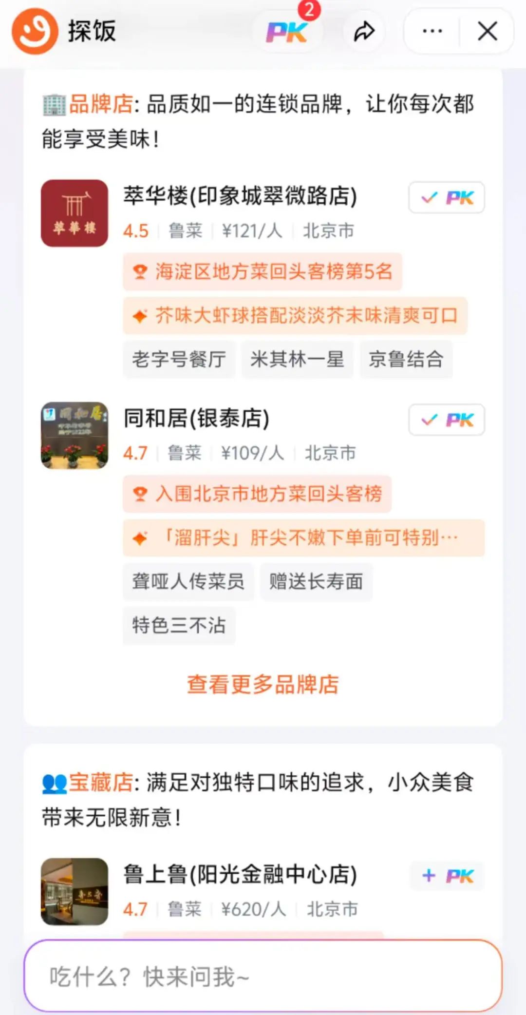 实际上,可以直接问一下探饭美食的问题,比如“北京有什么好吃的鲁菜馆”,然后,探饭将根据其位置,并根据加盟品牌和小众美食,分为品牌店和宝藏店。,每个人都在附近列出了一家关于鲁菜的餐厅。探索饭菜也会给出具体的推荐理由,比如同和居(银泰店)入围北京当地菜品回头店,有滑肝尖的特色菜,还赠送长寿面等等。