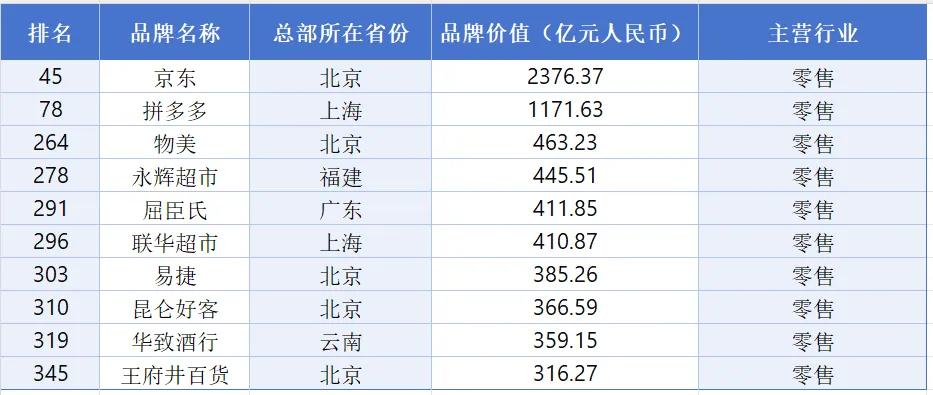 零售企业的排名和品牌价值在今年的榜单中如下: