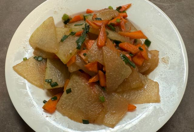 于是,她把冬瓜片和剩下的一根胡萝卜切丝炒了,又甜又甜。