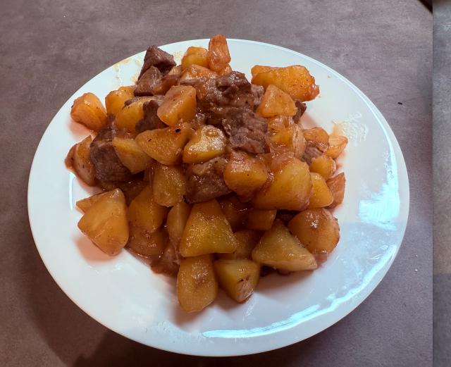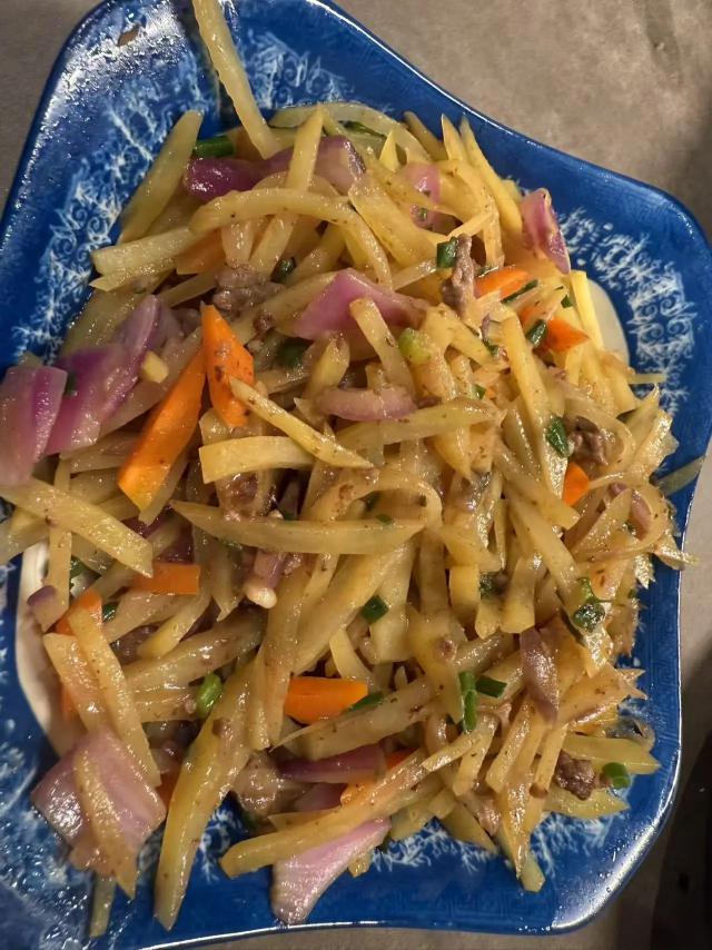 她没有和我商量,自言自语,做土豆丝快炒牛肉,还放了许多洋葱和糖。