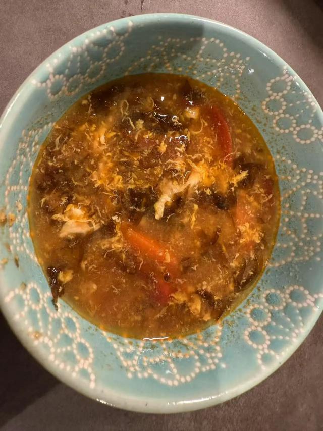 大量的虾、番茄、鸡蛋和紫菜,还加入了大量的糖,做得很粘,我一口下去,差点没死。