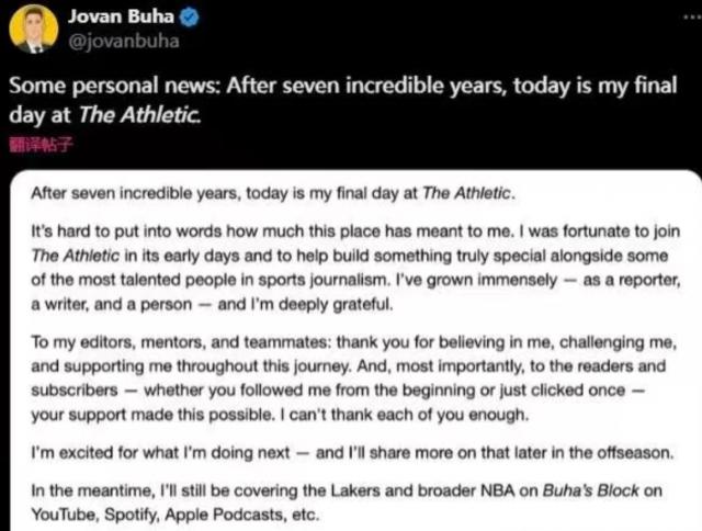 所以,很多球迷抱怨,Buha 名义上是跟队记者,实际上是搞球员心态。所以,Buha 离开队伍几乎达到了人人叫好的程度。Buha 离队的消息刚刚发布,《洛杉矶时报》记者 Dan Woike 迅速宣布从报社辞职,并立即加入新东家,下一步将填补。 Buha 空缺离开。