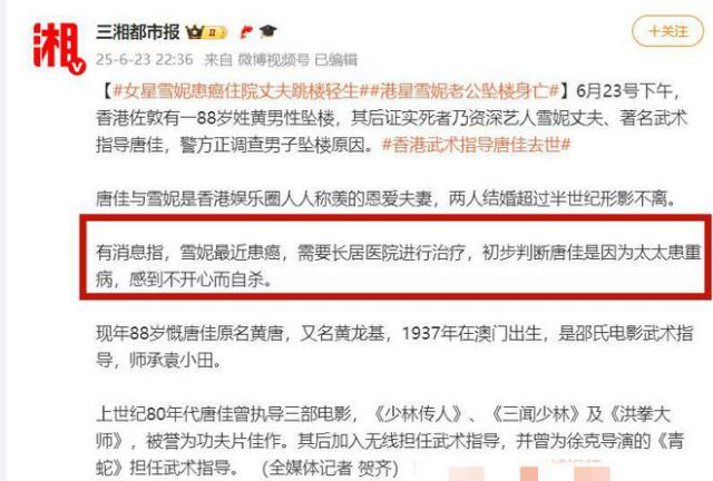 而且这次唐佳坠楼身亡,据港媒报道,疑似与妻子雪妮有关。