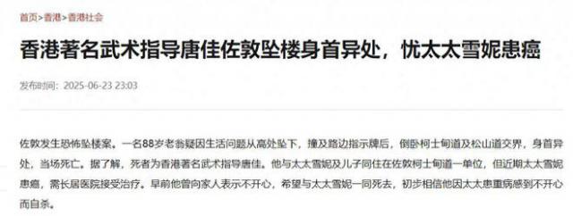 香港媒体报道称,唐佳的妻子因癌症住院,香港警方初步认定唐佳是自杀,因妻子病重而感到悲伤,随后选择自杀。