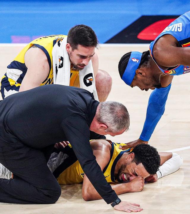 总决赛 G5,哈利伯顿右小腿受伤。如果放在常规赛,哈利伯顿至少需要几个星期的休息时间。但这是总决赛,哈利伯顿决定带伤出场。G6 他带队 108-91 击败雷霆,总比分追成 3 比 3 平。总决赛 G7 哈利伯顿的跟腱受伤在第一节退出比赛。