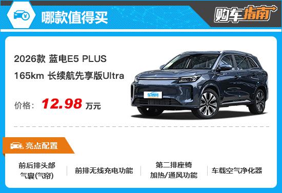 自从国内汽车市场“价格战”开始以来,所有汽车品牌都展示了自己的“看家本领”,卷配备、卷权益、卷价格已经成为常态。SUV 在国内市场上一直是热销车型, 10-15 大约一万元的价格区间,竞争非常激烈。前不久,2026 款蓝电 E5 PLUS 先享版正式上市,凭借“低价高配”的显著优势,吸引了众多消费者的关注。所以,面对新车型的客户应该怎样选择?本期《购车指南》将为您提供详细的分析。