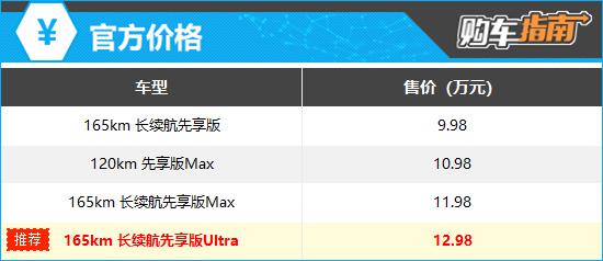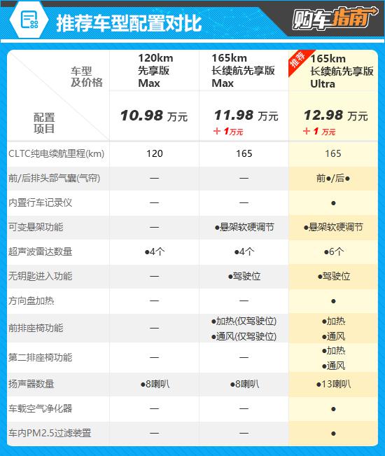 我们强烈推荐全系列车型的参考价格。 12.98 万元的 165km 长续航先享版 Ultra 车型。相比 165km 长续航先享版 Max 车型,推荐的车型只多了一些。 1 万元,却显著升级了安全、舒适、娱乐配置。在安全方面,建议车型在增加前增加。 / 后排头部气囊 ( 气帘 ) ,并且配有内置行车记录仪。在舒适配置方面,建议车型提供前排和第二排座椅的加热和通风功能,车内配备空气净化器,娱乐性更强,扬声器数量增加到 13 个。对家庭使用而言 SUV 换句话说,上述设备可以让每一位乘客都享受到“舒适平权”,可谓物超所值。