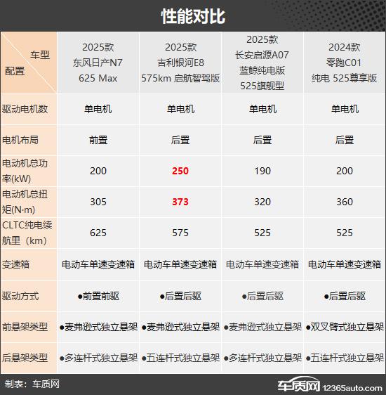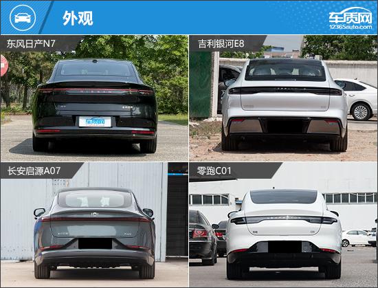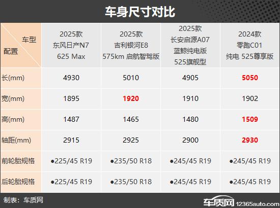 在车身长度、长度、高度和轴距方面,零跑是最好的。 C01,但另外三款车型也不甘落后,至少轴距已经达到或超过。 2900mm。零跑 C01、长安启源 A07 和东风日产 N7 配置的都是 19 只有吉利银河的英尺轮毂 E8 略显小气,轮毂尺寸为 18 英尺。