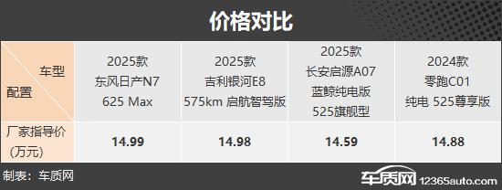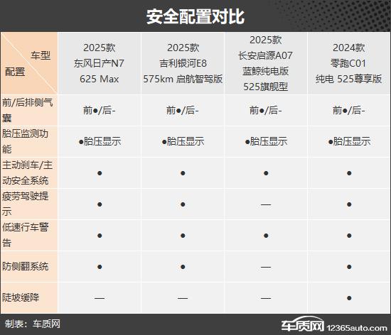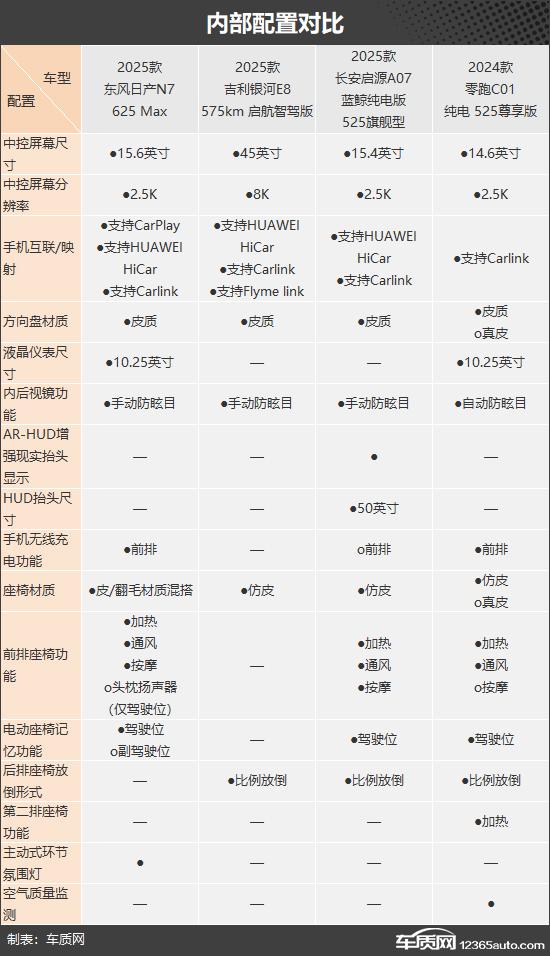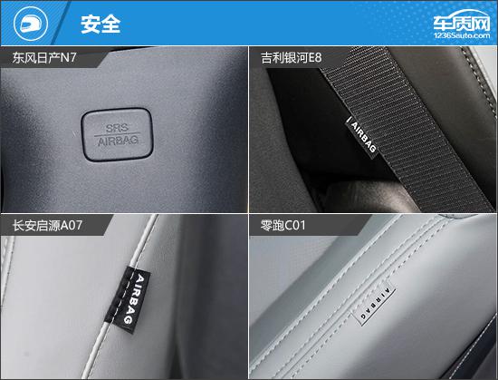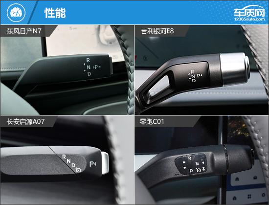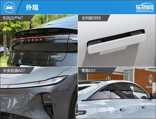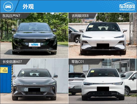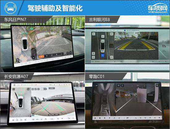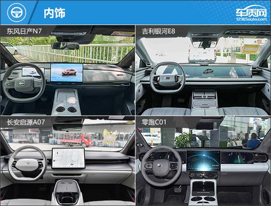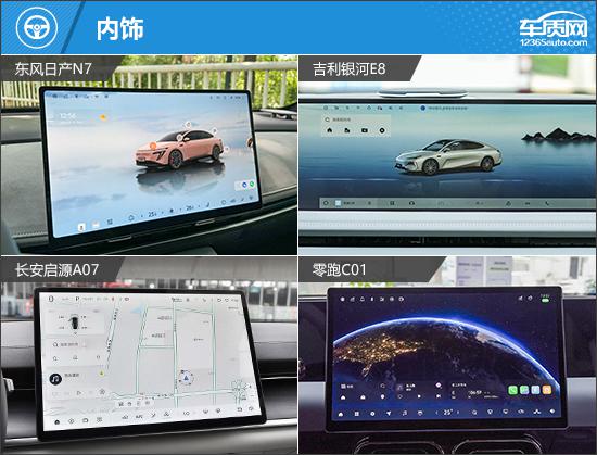 内饰部分,四款车均采用极简主义设计风格,并配有双辐多功能方向盘。吉利银河就是其中之一 E8 整体设计最为激进,其搭载 45 英尺 8K 中央控制面板,视觉效果非常震撼,具有强烈的现代感。零跑 C01 配有三个屏幕,即 10.25 14.6英寸全液晶仪表 英寸中央控制面板和 10.25 英尺副驾娱乐屏。相比之下,东风日产 N7 和长安启源 A07 内饰造型比较常规,好在用料扎实厚道,不会给人廉价的感觉。