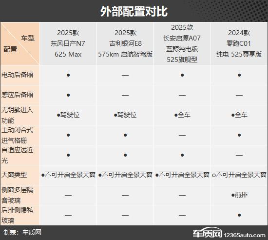 在外部设备阶段,四款车的区别并不大,至少基本设备可以满足日常使用的需要。东风日产 N7 和吉利银河 E8 只配备驾驶座无勺进入功能,但前者独享感应后备箱。长安启源 A07 整体表现平淡无奇,而零跑则不起眼。 C01 其亮点主要是配备了前侧窗多层隔音玻璃和后侧隐私玻璃。